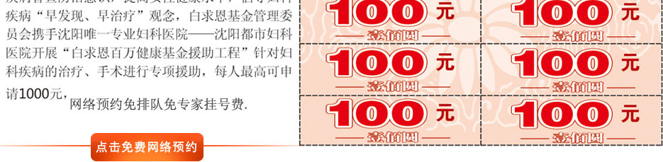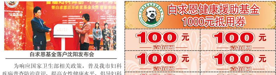 为了关爱女性健康、积极贯彻落实“两会”新医改政策,中国医促会合作推广专业委员会、沈阳市沈河区妇女联合会联合携手白求恩基金主办的“白求恩基金女性健康援助”。 沈阳都市妇科医院作为此次大型公益活动的上级指定定点合作医院,届时,京、沪三甲知名妇科医师汇聚我院,参与落实新医改、白求恩百万基金女性健康专项援助工作。